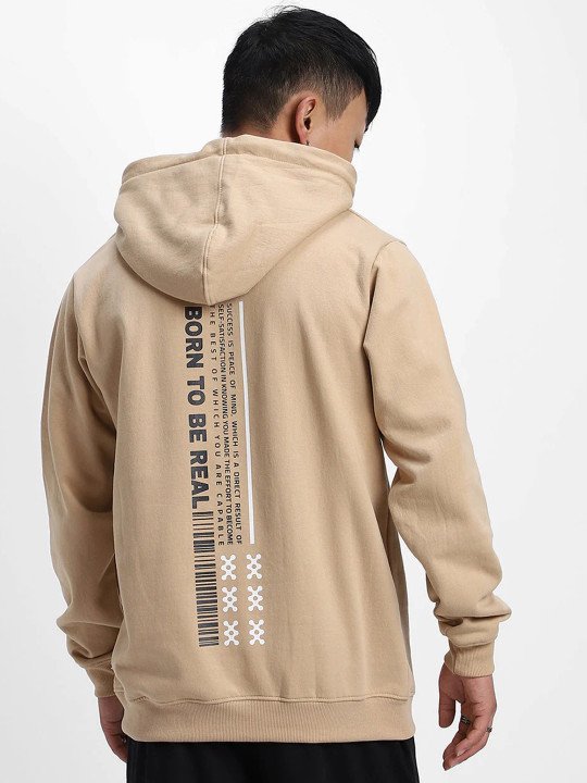 Men Beige Graphic Printed Cotton Fleece Regular Fit Hooded Pullover Sweatshirt